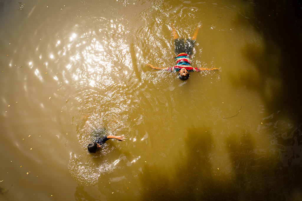 This image was taken during the first photo tour of 2016: On our way to Sala Bai (a non-profit restaurant training underprivileged children in hospitality work) for lunch, the light may have been harsh but we had no shortage of interesting subjects, like these children swimming in the Siem Reap River near the centre of town. Régis leaned over the side of the bridge to capture this “From The Sky” angle. We love the unique perspective of this vantage point. Photo taken during our Beyond Angkor tour.