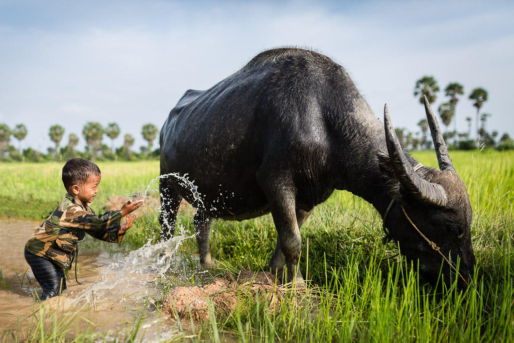 The skies are blue on rainy season mornings, and the downpours in the afternoon are often torrential. July is the beginning of the rainy season in Cambodia, and is the favourite season among ATP photographers to photograph the lush countryside. We love the contrast in this image between the tiny master and colossal beast. Photo taken during a Custom tour focusing on countryside and village life.